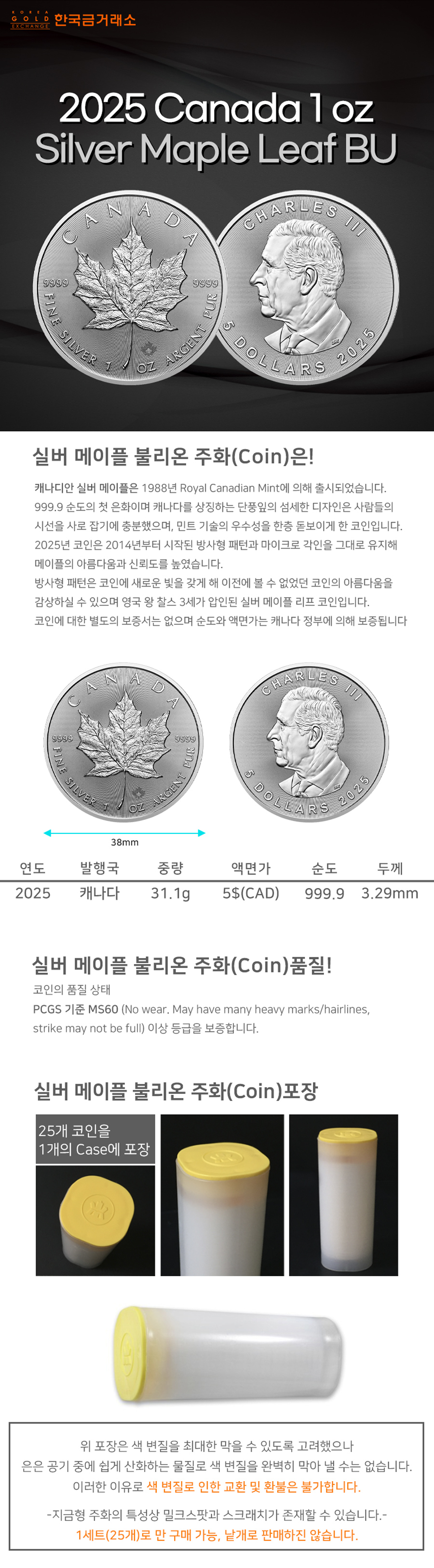 2025 1온스 실버 메이플 불리온 주화(Coin) 5$(CAD) 25ea